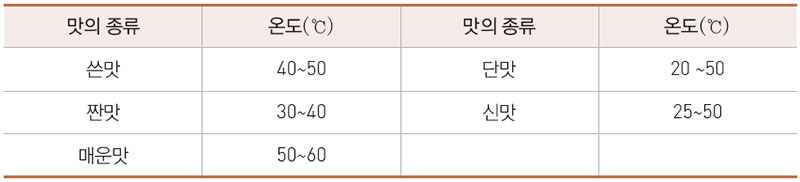- 물 : 13℃에서 가장 맛있게 느껴지며, 35~40℃에서는 혀의 감각이 무뎌져 맛을 잘 느끼기 어렵습니다.