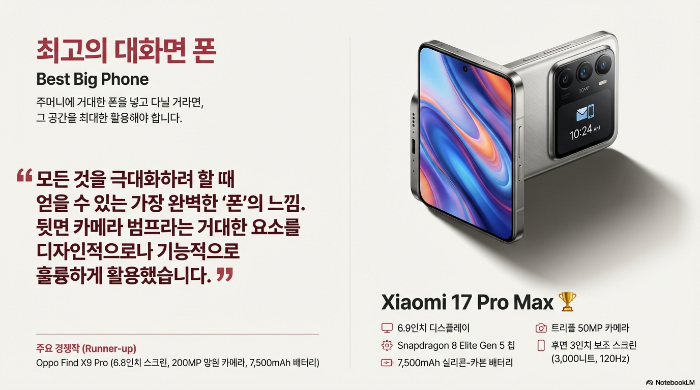 • 🥈 러너업: Xiaomi 17 Pro Max (7500mAh 배터리, 22.5W 역방향 무선 충전 지원).