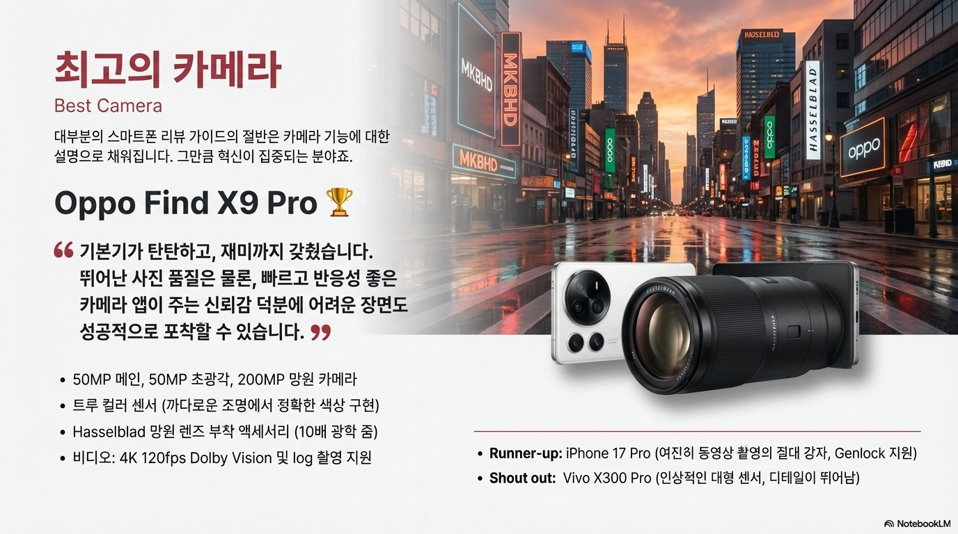 • 🥈 러너업: Oppo Find X9 Pro (6.8인치, 7500mAh 실리콘 카본 배터리, 200MP 망원 센서 포함 트리플 카메라)
