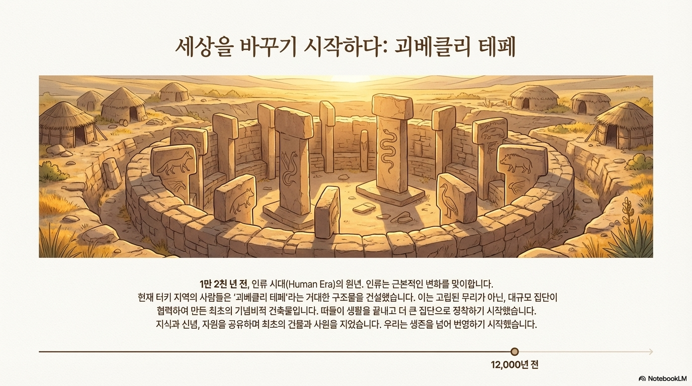 약 1만 2천 년 전, 터키의 괴베클리 테페 같은 거대 구조물을 짓기 시작하면서 인류는 방랑을 멈추고 정착을 시작했습니다.