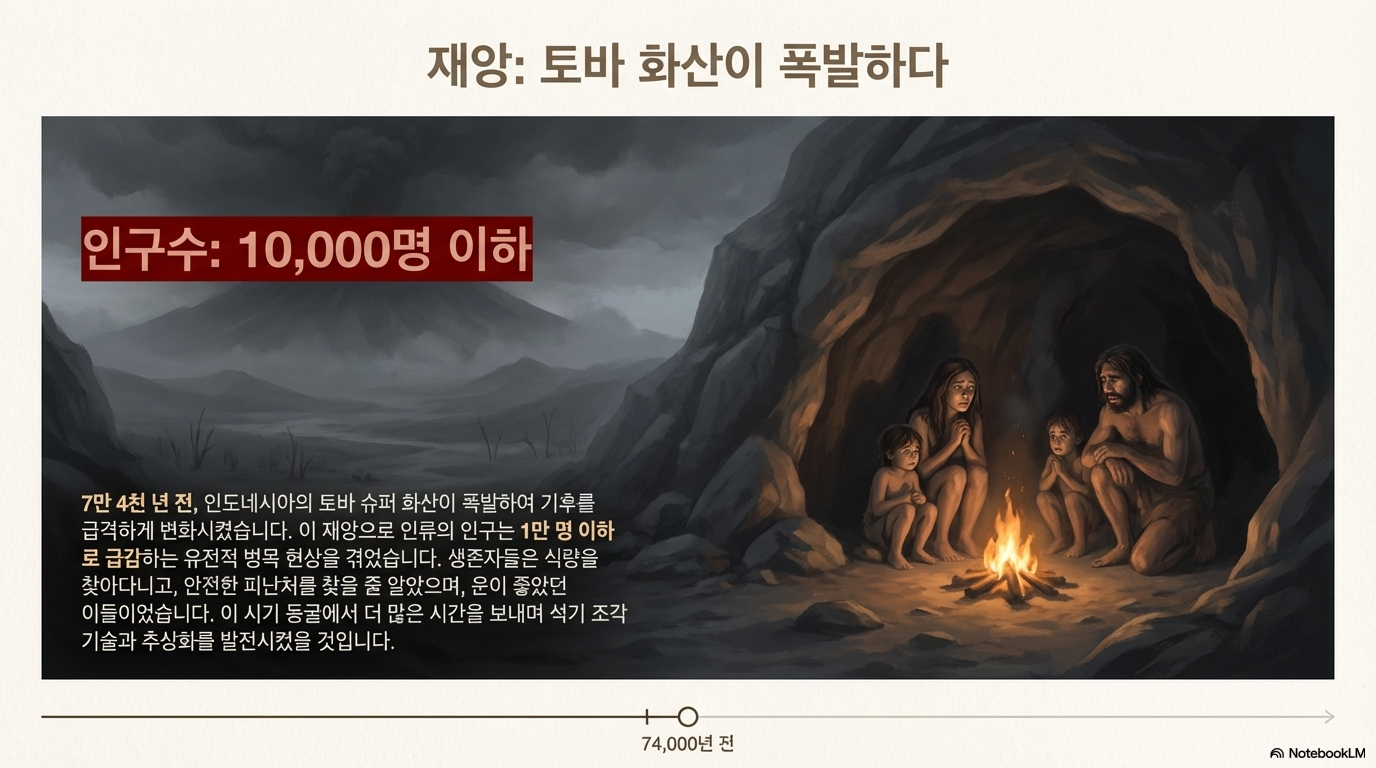 • 멸종 위기: 약 7만 4천 년 전 인도네시아의 토바 슈퍼 화산 폭발로 인해 인류 전체 인구가