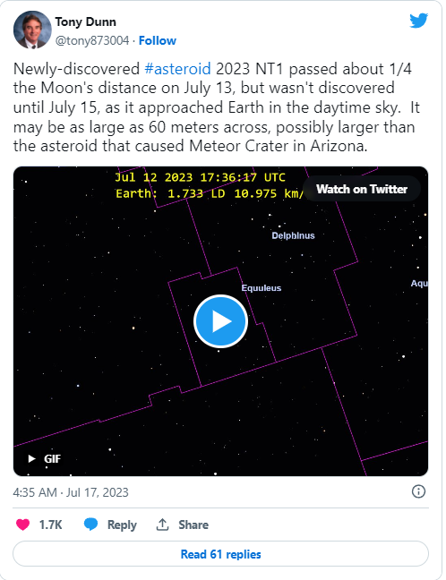 소행성은 달과 지구 사이 거리의 1/4 내내에 위치해 있었으며, 2023년 7월 13일 UTC 10:12에 지구에 가장 가까웠습니다. 그러나 이 위기 상황을 관측하는 관측소는 없었고, 그 이유는 이 소행성이 우주 암석으로부터 우리의 방어 체계에서 알려진 약점인 태양의 방향에서 왔기 때문입니다.